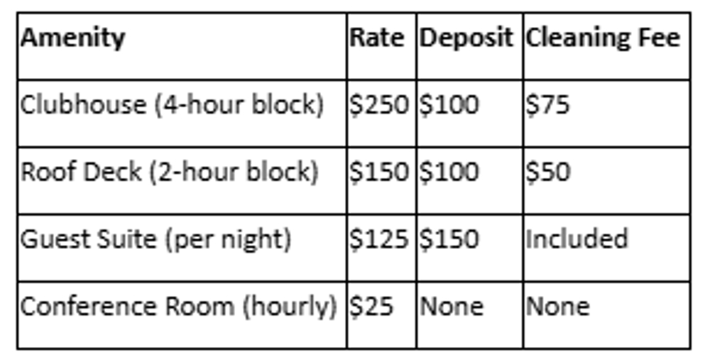 Cleaning fees typically range from $50 to $100 depending on space size and local labor costs. The fee should cover actual cleaning expenses while remaining palatable to residents. Consider whether to charge separately or bundle cleaning into the booking rate based on your community's preferences.